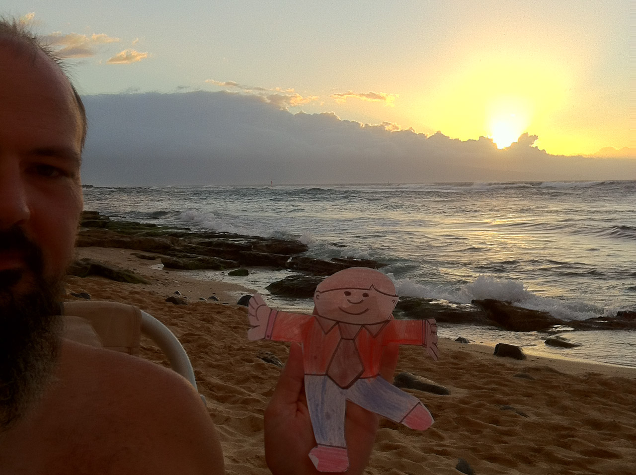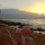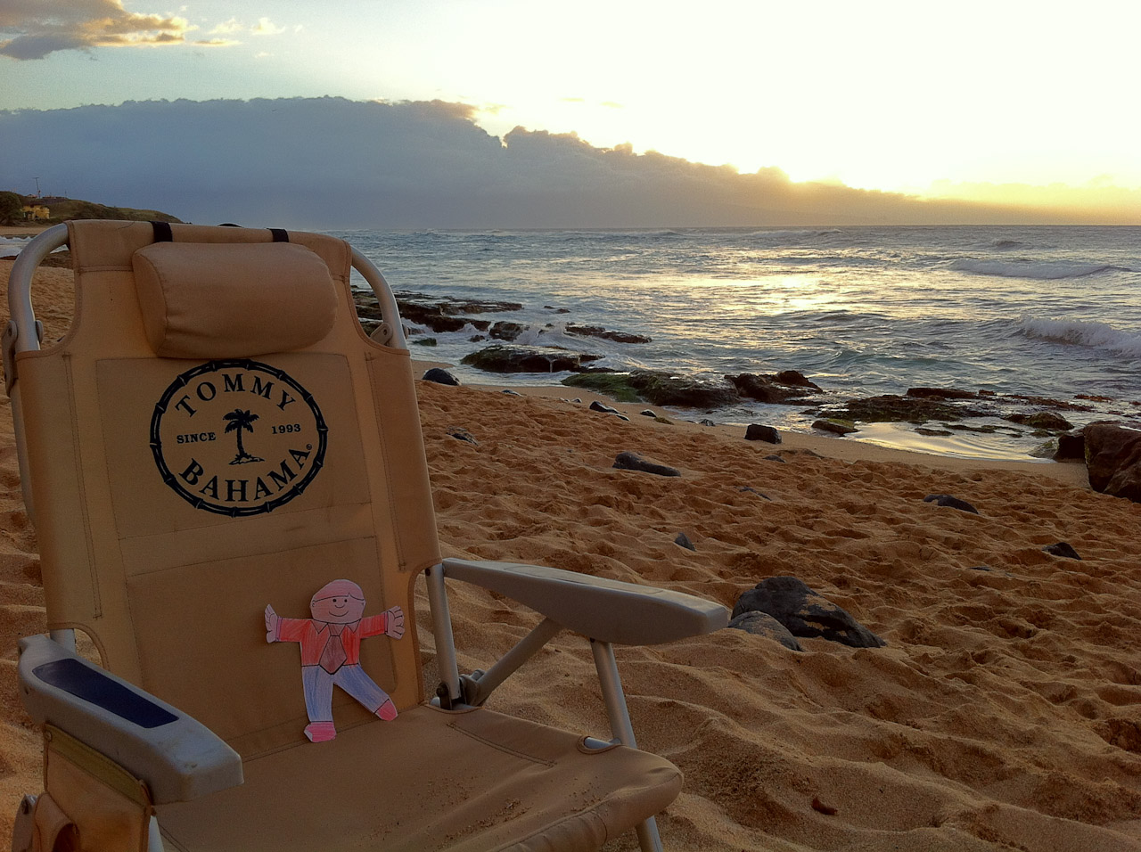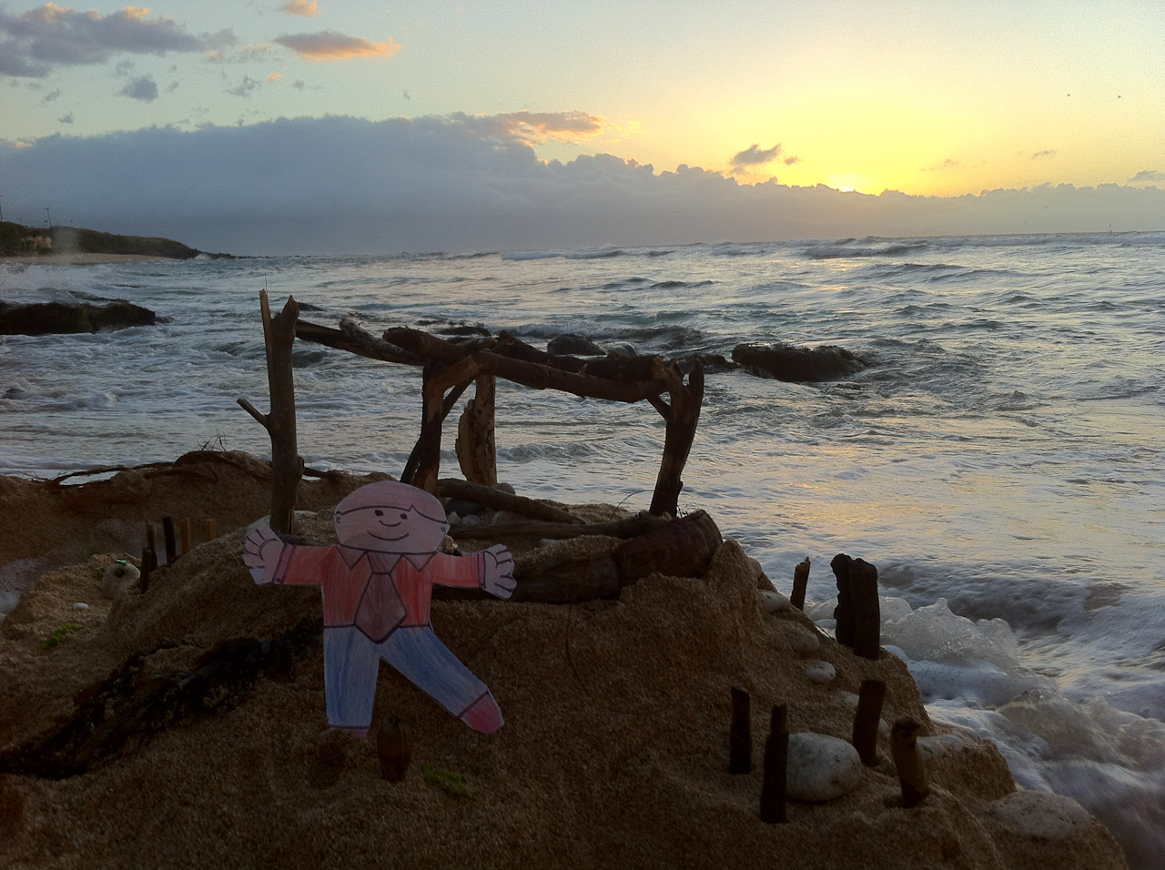 “Flat Stanley came to visit me in Maui, Hawaii. We went to Ho’okipa beach where there are lots of surfers and wind surfers, you can spot a windsurfer on the horizon just above Stanley’s left hand. We built a sand castle together and then I went surfing while Flat Stanley sat on the beach and enjoyed the sunset. When I came back from surfing a bunch of Hawaiian green sea turtles had noticed the awesome sand castle and decided to come up onto the beach and sleep in the castle for the night.”