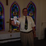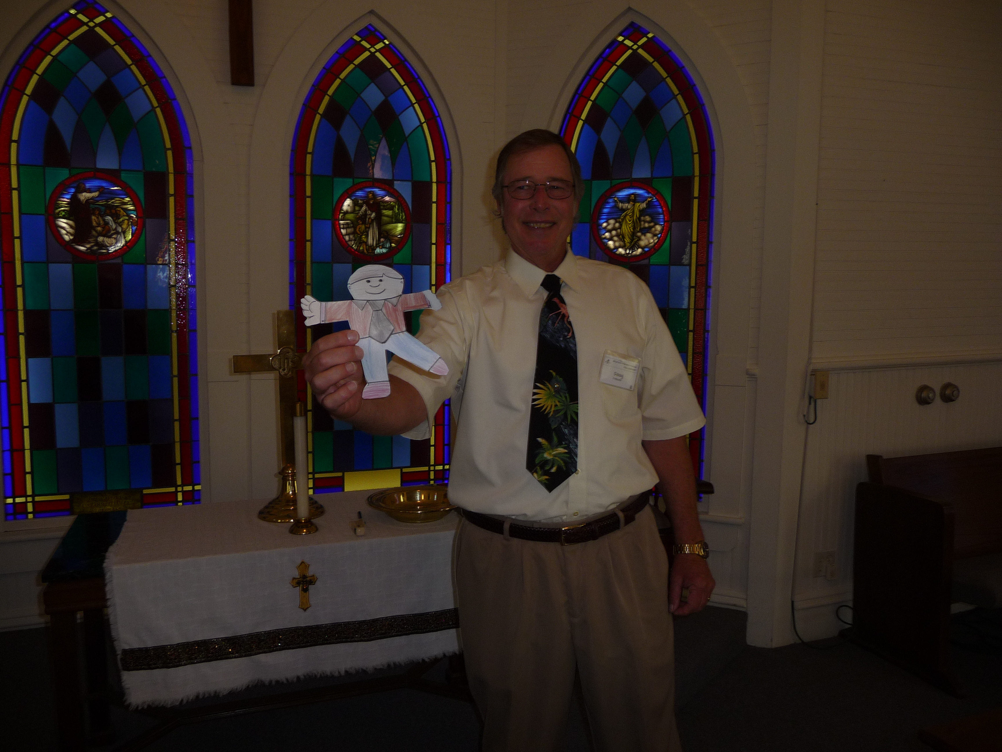 “Flat Stanley visiting Uncle Doug at my church, Bastrop Presbyterian Fellowship, at Cedar Creek Chapel in Cedar Creek, Texas. Uncle Doug is pastor of this church, and Flat Stanley joined me up front after the benediction Sunday. He enjoyed singing with everyone there, although his pitch was a little flat! (That was a joke.)”